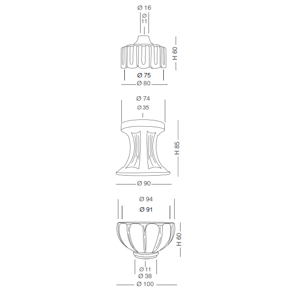 14-027 Colonna componibile - Ø100 x H60 - Foro passante Ø11 - Piano sopra Ø94 - Sede sopra Ø91 - Piano sotto Ø38