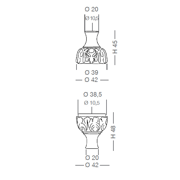 14-045 Distanziale - Ø42 x H45 - Foro passante Ø10,5 - Piano sopra Ø20 - Piano sotto Ø39